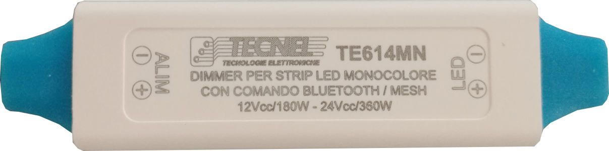 Codici TE614M DIMMER STRIP LED monocolore con tecnologia a Mosfet in PWM comando SMART APP Bluetooth codice con Memoria di Funzionamento e di Stato in grado di mantenere la luminosità impostata anche per successive accensioni e spegnimenti. Portata massima 1CHx10A 12Vcc 24Vcc (120W - 240W). Per aumentare la potenza controllata si deve ricorrere allo schema MASTER SLAVE dove il Dimmer a comando SMART APP Bluetooth codice TE614M in funzione di Master può controllare e sincronizzare fino a 10 Amplificatori di segnale PWM in funzione di Slave, come il MINIREPM o il PWMREP. Protezioni dal circuito aperto (OCP), dal corto circuito (SCP), dal sovraccarico (OPP), dalla sovratemperatura (OTP) e dall’inversione di polarità, tutte auto ripristinanti. Collegamenti filari. Grado di protezione IP20.